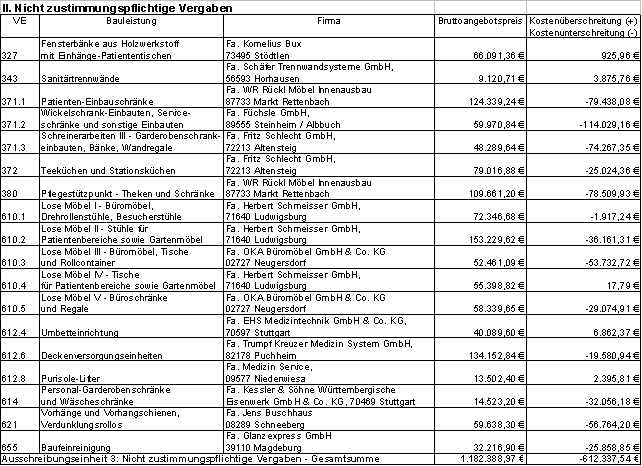 der Verwaltung Der Krankenhausausschuss beschließt für die Erstellung des Betten- und Behandlungsbaus Operative Fachbereiche [Bauabschnitt 3 (BA 3)] die Vergabe folgender Bauleistungen: 1. Die Festeinbauten aus Stahlblech (VE 612.7) werden an die Firma Metallwarenfabrik Walter H. Becker, Anzenkirchener Strasse 4, in 84371 Triftern zum Bruttoangebotspreis von 295.308,16 € vergeben. 2. Die OP-Tischsysteme (VE 612.3) werden an die Fa. EHS Medizintechnik GmbH & Co. KG, Julius-Hölder-Str. 30, in 70597 Stuttgart zum Bruttoangebotspreis von 428.396,12 € vergeben. Sachverhalt/Begründung: Im Rahmen einer 3. Ausschreibungseinheit für den Bauabschnitt 3 der Virngrund-Klinik Ellwangen wurden zwischenzeitlich weitere Vergabeeinheiten (VE) submittiert. Das Ergebnis dieser Ausschreibungen ist in den beiliegenden Preisspiegeln dargestellt. (s. Anlagen). Im Bereich der zustimmungspflichtigen Vergabeeinheiten mit einer Einzelbruttovergabesumme von mehr als 250.000 € konnte folgendes Ergebnis erzielt werden: