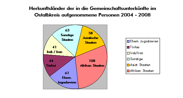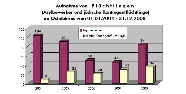 Nachdem die Zahl der dem Ostalbkreis zugewiesenen Flüchtlinge (Asylbewerber und jüdische Kontingentflüchtlinge) in den Jahren 2004 - 2007 rückläufig war, ist seit 2008 die Zahl der Asylbewerber wieder gestiegen. Insbesondere die Zahl irakischer Flüchtlinge, die einen Asylantrag stellen, hat sich seit dem letzten Jahr stark erhöht.