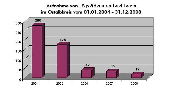 Die Zahl der dem Ostalbkreis zugewiesenen und in den Übergangswohnheimen des Kreises untergebrachten Spätaussiedler ist seit Jahren rückläufig. Hauptgrund hierfür ist, dass nicht nur Spätaussiedler selbst, sondern alle mit im Familienverbund einreisenden Angehörigen über ausreichende deutsche Sprachkenntnisse verfügen müssen.