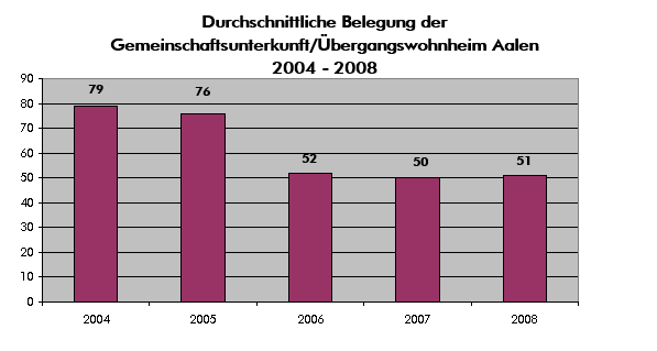 Die dem Ostalbkreis zugewiesenen Spätaussiedler und jüdischen Kontingentflüchtlinge werden zentral in der Unterkunft in Aalen, Ulmer Str. 117 untergebracht. Beide Personenkreise sind russischsprechend und erhalten Grundsicherungsleistungen für Arbeitssuchende nach Sozialgesetzbuch II (SGB II) bzw. Sozialhilfe nach Sozialgesetzbuch XII (SGB XII). Außerdem sollen dort die im Frühjahr 2009 zu erwartenden irakischen Kontingentflüchtlinge untergebracht werden. Der Ostalbkreis rechnet mit ca. 10 -15 Personen, die aufgenommen werden. Das Gebäude wurde von einem privaten Vermieter angemietet und wird zu 50 % als Gemeinschaftsunterkunft und zu 50 % als Übergangswohnheim genutzt. Die Unterkunft ist bei einer Kapazität von 101 Plätzen derzeit mit 50 Personen belegt (Stand 03/2009).