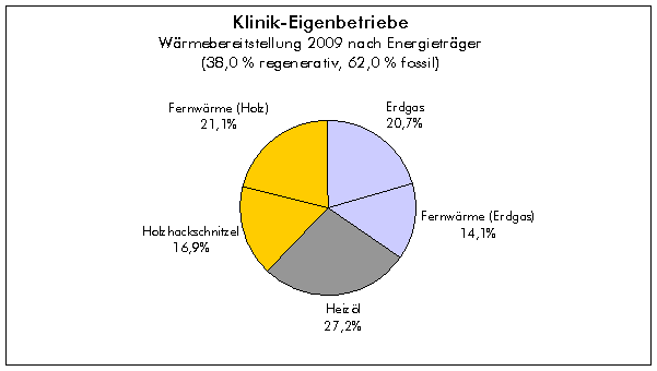 Die Klinik-Eigenbetriebe weisen mit einem Erneuerbare-Energien-Anteil von 38 % an der gesamten Wärmebereitstellung im Jahr 2009 einen sehr guten Wert auf. Das Ostalb-Klinikum Aalen bezieht Fernwärme, die zu 60% aus dem Energieträger Holz und zu 40% aus Erdgas gewonnen wird. Am Stauferklinikum Schwäbisch Gmünd ist eine große Holzhackschnitzelheizung in Betrieb, die 37% des dortigen Wärmebedarfs umweltfreundlich und kostengünstig abdeckt. Der Wärmebedarf für die St.-Anna-Virngrund-Klinik in Ellwangen wird ausschließlich über erdgasbetriebene Blockheizkraftwerke bereitgestellt. Diese Kraft-Wärme-Kopplungsanlagen werden mit einer hohen Energieeffizienz betrieben und erzeugen gleichzeitig Strom und Wärme. Dies bedeutet gegenüber konventionellen Erdgaskesseln eine Wirkungsgradverbesserung von ca. 16% und steht deshalb für einen verantwortungsvollen Umgang mit den natürlichen Ressourcen. 2. Wärmeversorgung durch den erneuerbaren