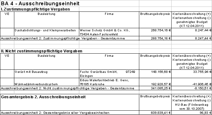 Die Vergabe der weiteren Bauleistungen für den Neubau Innere Medizin und weitere Funktionsbereiche (BA 4) ist in mehrere Ausschreibungseinheiten untergliedert. Die zwischenzeitliche Submission des 2. Ausschreibungspakets erfolgte am 02.05.2011. Die nachfolgende Tabelle, sowie die in der Anlage beiliegenden Preisspiegel zeigen detailliert das Ergebnis der im Krankenhausausschuss zu vergebenen Ausschreibungen aus der 2. Ausschreibungseinheit. Der Kostenvergleich basiert auf dem in der Sitzung des Kreistages am 12.04.2011 genehmigten Kostenbudgets (fortgeschriebene Kostenberechnung des Förderantrags (Haushaltsuntersuchung Bau = HU-Bau) vom 30.10.2007).