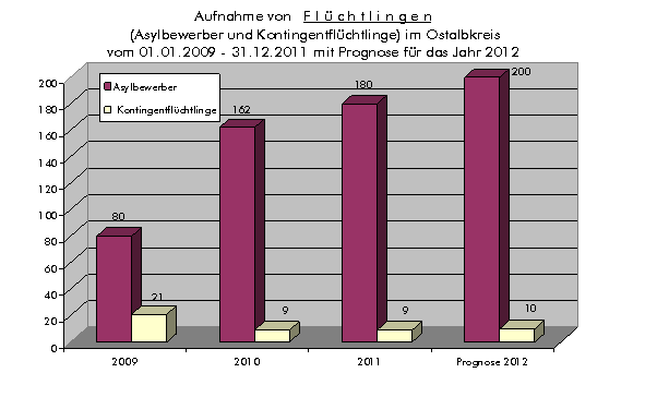 Die Zahl der in Deutschland gestellten Asylanträge ist gegenüber dem Vorjahreszeitraum Januar - Juli 2011 um 15 % gestiegen. Baden-Württemberg rechnet derzeit mit einem monatlichen Zugang von 580 bis 690 Asylbewerbern, was einen Jahreszugang von etwa 6.000 bis 6.600 Personen bedeutet. Der Ostalbkreis geht 2012 von einer Zuweisung von ca. 200 Asylbewerbern aus.