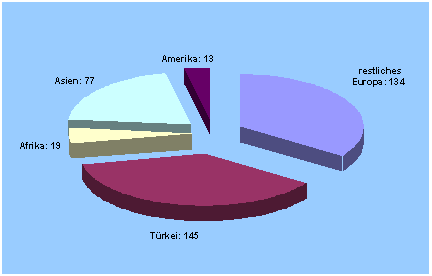 Ungefähr 1/3 (145) aller im Jahr 2012 eingebürgerten Personen stammen aus der Türkei, gefolgt von Bewerbern aus Serbien/Kosovo (38 Personen), Griechenland (19), Rumänien (14) und Italien (13), die zusammen mit den übrigen EU-Staaten das zweite Drittel ausmachen. 28 % der Eingebürgerten sind aus Asien, Afrika und Amerika.