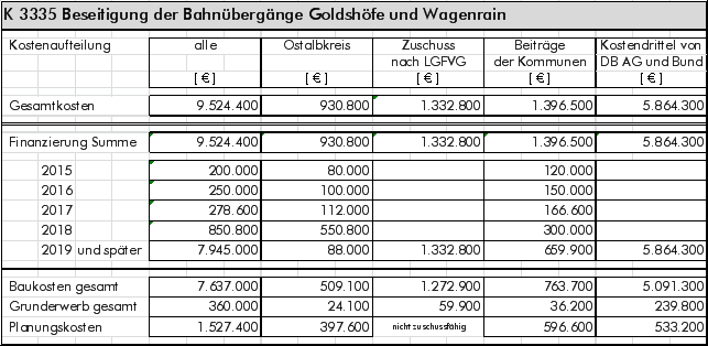 Bei dem Vorhaben handelt es sich um eine Maßnahme nach § 3 des Eisenbahnkreuzungsgesetze (EKrG). Bei solchen Eisenbahnkreuzungsmaßnahmen werden die Herstellungskosten einschließlich der Grunderwerbskosten zu je einem Drittel von der Deutschen Bahn, vom Bund und vom Straßenbaulastträger getragen. Die Planungskosten trägt der Straßenbaulastträger, der vom Bund und von der DB AG auf deren Drittel jeweils einen Verwaltungskostenersatz von 10 % erhält. Für die auf ihn entfallenden Herstellungskosten erhält der Straßenbaulastträger nach LGVFG einen Zuschuss in Höhe von 50 %. Verkehrsminister Hermann hat am 17.04.2014 die Aufnahme des Vorhabens in das Förderprogramm zugesagt. Die Planungskosten hingegen werden nicht bezuschusst und sind vom Vorhabenträger zu tragen. Damit ergeben sich folgende Kosten, die durch die Stadt Aalen, die Gemeinden Hüttlingen und Rainau sowie den Ostalbkreis zu finanzieren sind: