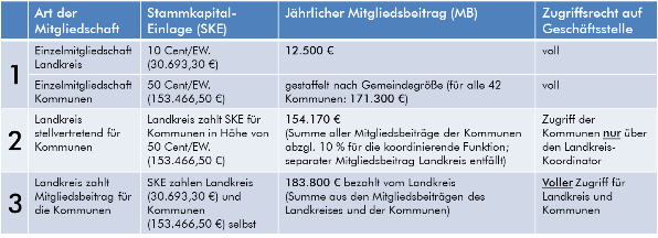 Bei Variante 3 bringen sich die Kommunen mit der Stammkapitaleinlage in den Verbund ein. Der Landkreis trägt im Gegenzug die jährlichen Mitgliedsbeiträge aller Kommunen, ohne dabei den satzungsgemäß möglichen Rabatt für eine koordinierende Funktion in Anspruch zu nehmen. Dadurch haben alle Kommunen den einer Einzelmitgliedschaft vergleichbaren Status mit vollem direkten Zugriffsrecht auf die künftige Geschäftsstelle des Verbunds und individuellem Stimmrecht in der Beteiligtenversammlung. Die Verwaltung empfiehlt daher die Variante 3 zum Beschluss.
