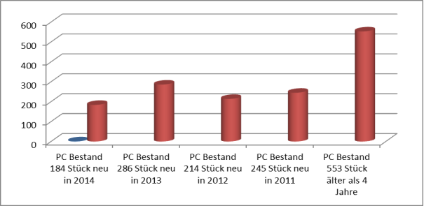 Die aktuelle Nutzungsdauer der Hardware liegt bei Arbeitsplatzrechnern in der Landkreisverwaltung etwa bei 6 Jahren, bei Monitoren oft noch länger. Dies resultiert daraus, dass in den vergangenen Jahren die benötigte Anzahl an Geräten - den Restriktionen des Haushalts geschuldet – nicht immer beschafft werden konnte, um eine Nutzungsdauer von max. 4 Jahren zu erreichen. In den letzten Jahren konnten zwar deutliche Verbesserungen erzielt werden, jedoch wurde das gesteckte Ziel noch nicht erreicht. Eine Nutzungsdauer von mehr als 4 Jahren ist aufgrund der immer schneller erfolgenden technischen Entwicklung in den meisten Fällen unvermeidbar mit Abstrichen bei der PC-Leistung verbunden. Durch die erhöhte Mittelbereitstellung in den beiden letzten Haushaltsjahren konnte die einstige Nutzungsdauer von etwa 7-8 Jahren bei der PC-Hardware auf zwischenzeitlich schon 6 Jahre gesenkt werden. In der nachfolgend dargestellten Grafik ist die Altersstruktur ersichtlich. 2014 hatten wir einen Gesamtbestand von 1482 PCs in folgendem Alter: