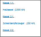 - 1 Holzhackschnitzelkessel (Baujahr 2003, 2.500 kW Wärmeleistung)