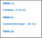 - 2 heizöl-/erdgasbefeuerte Dampfkessel (Baujahr 1982, jeweils 2 t/h Dampfleistung