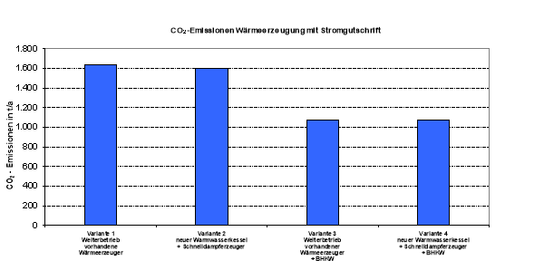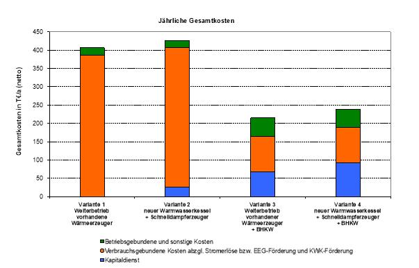 Aufgrund des ganzjährigen Wärmebedarfs (neben Gebäudeheizung v. a. dezentrale Trinkwassererzeugung im Sommer) sowie einer hohen Grundlast an Strom wurde der Einsatz eines BHKWs untersucht.
