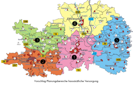 Mit der Aufteilung der drei Mittelbereiche in fünf Planungsbereiche wird das Ziel verfolgt, die ärztliche Versorgung bedarfsgerechter zu gestalten sowie die Ungleichverteilung der Ärztinnen und Ärzte in der hausärztlichen Versorgung des Ostalbkreises deutlich zu machen und steuernd entgegenzuwirken. Die Versorgungsgrade im Mittelbereich Aalen betrugen zuletzt 112,0 %, im Mittelbereich Schwäbisch Gmünd 101,6 % und im Mittelbereich Ellwangen 100,6 % und konstatieren damit eine gute Versorgung im Landkreis. Betrachtet man aber die Raumschaften Schwäbischer Wald (Gebiet 3 im Vorschlag des Landkreises zur Neustrukturierung der Planungsbereiche) und Härtsfeld (Gebiet 5) wird deutlich, dass die Versorgungsgrade der dortigen Unterzentren mit ihren regional gewachsenen Verflechtungsbereichen bei unterdurchschnittlichen 76,1 % (Schwäbischer Wald) bzw. 96,3 % (Härtsfeld) liegen. Laut Auskunft von der KVBW wird durch die Aufteilung des Mittelbereichs Schwäbisch Gmünd im neuen Gebiet 2 (Schwäbisch Gmünd) aufgrund der guten Versorgungsdichte in diesem Gebiet aktuell eine Zulassungssperre für Neuzulassungen in der hausärztlichen Versorgung eintreten.