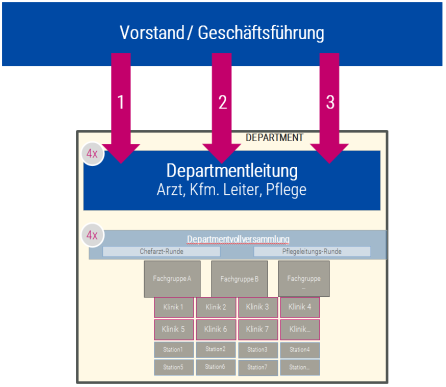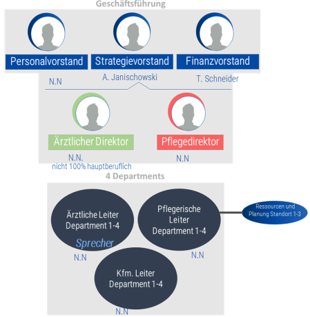 Die Departmentleitung besteht jeweils aus einem ärztlichen, pflegerischen und kaufmännischen Part. Diese Leitung ist mit Kompetenzen und Verantwortung ausgestattet und muss diese gegenüber der Geschäftsführung berichten. Der kaufmännische Leiter hat darauf zu achten, dass alle formal-administrative Aspekte berücksichtigt werden. Gleichzeitig wacht er im Detail über die Einhaltung der Budgets des Departments. Die kaufmännischen Leiter können jeweils Verantwortung für mehr als ein Department tragen. Sprecher der Departmentleitung ist der ärztliche Vertreter.