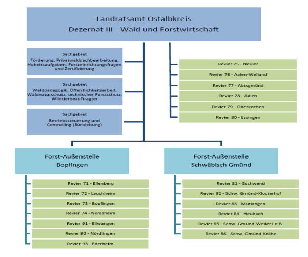 Die Geschäftsbereichsleitung und die wichtigen zentralen Sachgebiete mit den Inhalten Hoheit, Öffentlichkeitsarbeit, Waldpädagogik, Waldnaturschutz und Förderung befinden sich am zentralen Standort in Aalen.