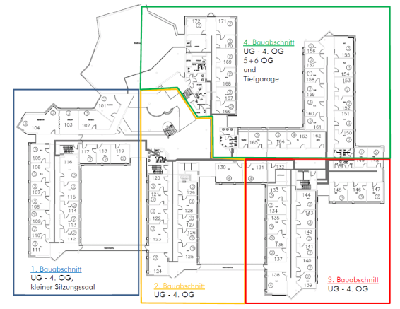 Die Durchführung der Baumaßnahmen wird den Verwaltungsbetrieb nur geringfügig betreffen und abschnittsweise durchgeführt. Hierzu wird das Ostalbkreishaus in vier Bauabschnitte eingeteilt. In jedem dieser Bauabschnitte werden die benötigten Arbeiten vollständig vom Untergeschoss bis zum Dachgeschoss durchgeführt.