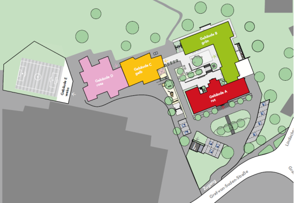 Von der An- und Umbaumaßnahme nicht erfasst sind die Gebäude C und D mit weiteren Unterrichts-, Therapie- und Werkstatträumen.