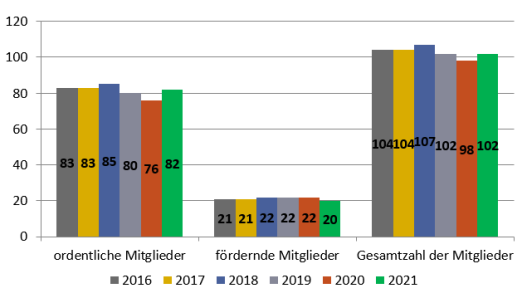 Die Gesamtmitgliederzahl des Vereins stieg zum Ende des Jahres 2020 auf einen Mitgliederstand von 102 Mitgliedern. Die Nettomitgliederveränderung bilanziert sich aus acht Vereinsbeitritten und vier Austritten.