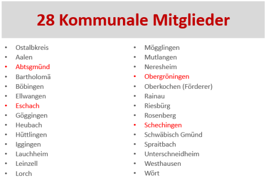 In 2021 sind folgende Kommunen dem EKO als ordentliches Mitglied beigetreten: Abtsgmünd, Eschach, Obergröningen und Schechingen.