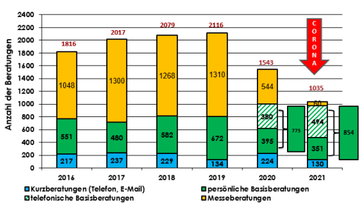 Wieder konnte das hohe Niveau der Gesamt-Beratungszahlen aus den Vorjahren (bis 2019) pandemiebedingt nicht erreicht werden. Die Zahl der ausführlichen Basisberatungen hat sich jedoch weiter gesteigert, während bei den Messeberatungen nochmals ein deutlicher Einbruch zu verzeichnen ist.