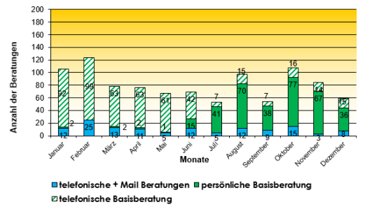 Basisberatungen, persönlich: 351 Basisberatungen, telefonisch: 494 Kurzberatungen: 130 Messeberatungen: 60