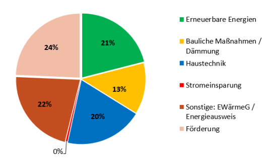 Aus der nachfolgenden Grafik ist ersichtlich, dass auch in 2021 der Schwerpunkt der Beratungstätigkeit weiterhin im Bereich von Altbausanierungen und Heizungsmodernisierungen, verbunden mit den jeweiligen Förderprogrammen, lag. Zudem lässt sich über die letzten Jahre feststellen, dass der Beratungsbedarf zum Baden-Württemberg-spezifischen Erneuerbaren-Wärme-Gesetz (EWärmeG) kontinuierlich zunimmt.