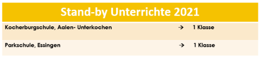 Für das Schuljahr 2020/2021 waren an insgesamt neun Schulen die Durchführung von Standby-Unterrichten eingeplant. Coronabedingt haben sieben Schulen abgesagt bzw. bestanden auf eine Präsenzveranstaltung. Letztlich wurden 2021 an den folgenden beiden Schulen Stand-by-Unterrichte im Online-Format durchgeführt: