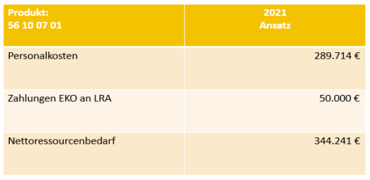 Wie schon in den Vorjahren war das EKO auch in 2021 unter der Produktnummer 56100701 wieder eigenständig im Haushalt des Ostalbkreises abgebildet. Der Haushaltsansatz (Nettoressourcenbedarf) für 2021 wurde mit 334.241 € beziffert. Hierin sind Personalkosten in Höhe von ca. 289.714 € enthalten.