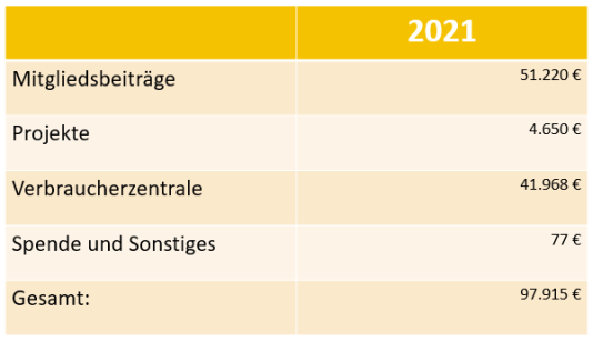 Als Einnahmen in 2021 konnte der Verein Energiekompetenz Ostalb e.V. neben den Mitgliedsbeiträgen in Höhe von 51.220 € auch durch das EKO-Team generierte Einnahmen aus Projekten und Beratungsleistungen für die Verbraucherzentrale, sowie Spenden und Sonstiges in Höhe von 46.695 € verbuchen. Dies ergibt einen Gesamteinnahmenbetrag von 97.915 €, wie die nachfolgende Grafik zeigt: