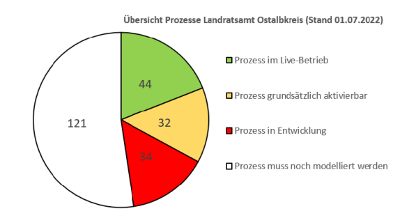 Verwaltungsintern wurden die 240 OZG-Leistungen in vier Kategorien eingeteilt: - Live-Betrieb (der Prozess ist bereits aktiviert und steht online zur Verfügung) - aktivierbar (der Prozess ist grundsätzlich aktivierbar und könnte online zur Verfügung gestellt werden) - in Entwicklung (der Prozess befindet sich in der Entwicklung) - offen (der Prozess muss noch modelliert/entwickelt werden)