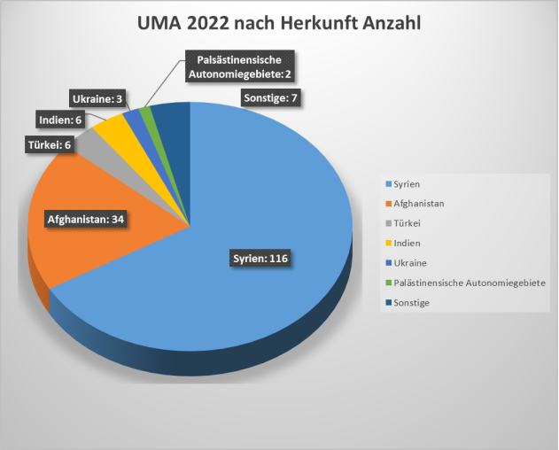 Der russische Angriffskrieg auf die Ukraine hat eine große Fluchtbewegung nach Deutschland ausgelöst. Dementsprechend wurde auch in der Jugendhilfe mit dem Zustrom hilfebedürftiger Minderjähriger aus der Ukraine gerechnet. Allerdings sind minderjährige Ukrainer, die ohne Eltern Zuflucht in Deutschland suchen, in den meisten Fällen in Begleitung von Verwandten oder Bekannten, die von den Eltern mit der Erziehung beauftragt wurden. In diesen Fällen ist es die Aufgabe des Jugendamts, die Erziehungsberechtigungen zu prüfen und Pflegeerlaubnisse auszustellen. Darüber hinaus werden bedarfsabhängig Jugendhilfeleistungen initiiert. So bilden den Schwerpunkt der UMA nicht Zuflucht suchende Kinder und Jugendliche aus der Ukraine, sondern UMA anderer Nationalitäten, insbesondere aus Syrien und Afghanistan.