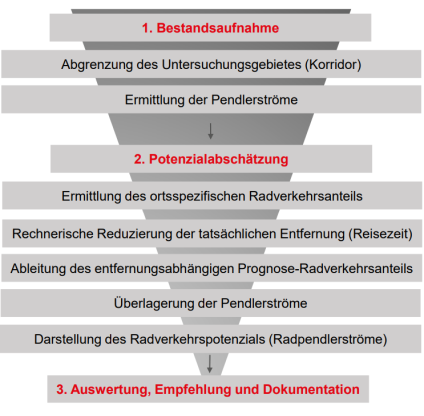 Das Verfahren zur Potenzialanalyse basiert auf den Pendlerverflechtungen zwischen den Wohn- und Arbeitsplätzen aller sozialversicherungspflichtig Beschäftigten über Kommunen hinweg (Ein- und Auspendler). Diese Datengrundlage steht durch die Bundesagentur für Arbeit zur Verfügung. Hierbei wurden neben den unmittelbar auf der Achse liegenden Kommunen auch weitere Nachbarkommunen einbezogen, bei denen zu erwarten ist, dass Radfahrende mindestens einen Teilabschnitt der potenziellen Radschnellverbindungen nutzen werden. Zur Berücksichtigung von Hin- und Rückwegen sowie Dienstfahrten, Urlaub und Krankheitstragen gibt die H RSV entsprechende Multiplikatoren vor. Für die Potenzialabschätzung wurde, soweit vorhanden, der ortsspezifische Radverkehrsanteil in die Projektion mit einbezogen. Standen keine ortsspezifischen Radverkehrsanteile zur Verfügung, wurde sich auf die ermittelten Modal Split-Werte aus der MID-Studie Deutschland bzw. Baden-Württemberg gestützt. Zur Abschätzung des Gesamtpotenzials einer möglichen Radschnellverbindung wurde zudem die Annahme getroffen, dass sich durch den Freizeitverkehr das Potenzial im jeweiligen Streckenabschnitt nochmals verdoppelt. Diese Annahme beruht auf dem Ergebnis des Fahrrad-Monitors Deutschland 2021, wonach das Fahrrad in etwa zu gleichen Teilen als Verkehrsmittel wie zu Freizeitzwecken eingesetzt wird.