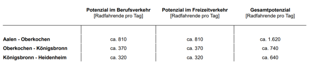 Das in den H RSV genannte Potenzial von mindestens 800 Radfahrenden/24h im Querschnitt im Berufsverkehr (ausgehend von den Pendlerströmen) wird nur auf dem Abschnitt zwischen Aalen und Oberkochen erreicht. Die ermittelten Potenziale auf dem Abschnitt Oberkochen – Heidenheim liegen bei etwa 300 – 400 Radfahrenden/24h im Querschnitt. Insgesamt ist für die Achse von Aalen bis Heidenheim daher nicht zu erwarten, dass die erforderliche Prognoseverkehrsstärke einer Radschnellverbindung von ca. 2.000 Radfahrenden pro Tag erreicht werden, auch nicht unter Berücksichtigung von zusätzlichen Freizeit- sowie Schul- und Ausbildungsverkehren. Vielmehr ist mit Potenzialen zwischen ca. 1.000 – 2.000 Radfahrende pro Tag zu rechnen. Es wird daher empfohlen, die Achse als Radvorrangroute weiterzuverfolgen und die Ausbaustandards entsprechend der H RSV anzustreben. Entscheidend für die Erreichung der Potenziale ist dabei die achsbezogene Umsetzung für den gesamten Abschnitt zwischen Aalen und Heidenheim.
