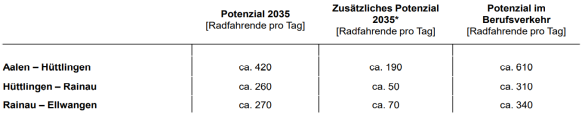 In der Sitzung des Ausschusses für Umweltschutz und Kreisentwicklung vom 24. Mai 2022 wurde vor diesem Hintergrund eine kreisweite Potenzialanalyse auf den Hauptverkehrsachsen als Vorabuntersuchung einer möglichen Machbarkeitsstudie für Radschnellverbindungen beschlossen. Dafür wurden auf den Strecken Aalen – Schwäbisch Gmünd, Ellwangen – Aalen und Aalen – Nördlingen die aktuellen Pendlerverflechtungen untersucht und hieraus – unter Berücksichtigung der angestrebten Verkehrsverlagerung vor dem Hintergrund der Klimaschutzziele – die zu erwartenden Radverkehrspotenziale erhoben. Als Maßnahme des Mobilitätspakts Aalen/Heidenheim wurden zusätzlich die Potenziale für einen möglichen Radschnellweg zwischen Aalen und Heidenheim untersucht. Damit liegen für alle Hauptverkehrsachsen im Landkreis die Potenziale für mögliche Radschnellverbindungen vor.