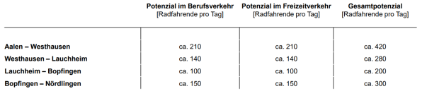 Die ermittelten Potenziale auf dem Abschnitt Aalen – Essingen und Böbingen a.d.R – Schwäbisch Gmünd liegen im Berufsverkehr bei etwa 500 Radfahrenden/ 24h im Querschnitt. Auf den Abschnitten Essingen – Mögglingen und Mögglingen – Böbingen a.d.R. wird ein Potenzial von ca. 200 - 300 Radfahrenden/ 24h im Querschnitt erreicht. Das in den H RSV genannte Potenzial von mindestens 800 Radfahrenden/ 24h im Querschnitt im Berufsverkehr (ausgehend von den Pendlerströmen) wird damit nicht erreicht. Auch unter Berücksichtigung von zusätzlichen Freizeit- sowie Schul- und Ausbildungsverkehren ist nicht zu erwarten, dass die erforderliche Prognose-Radverkehrsstärken einer Radschnellverbindung von ca. 2.000 Radfahrenden pro Tag erreicht werden. Vielmehr ist mit Potenzialen bis zu 1.000 Radfahrende pro Tag zu rechnen. Es wird daher empfohlen, die Achse im Standard des RadNETZ BW weiterzuverfolgen.