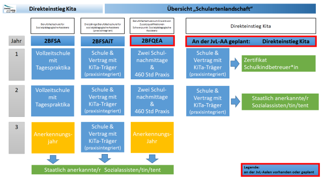 Das Regierungspräsidium Stuttgart (Referat 76) hat die JvL-Schule Aalen im Oktober 2022 angefragt, ob die JvL-Schule Aalen an dem Schulversuch „Direkteinstieg Kita“ teilnehmen könnte. Ausgangslage: