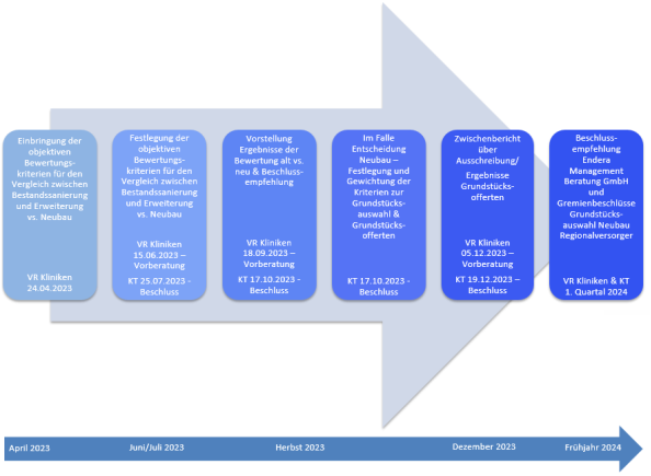 Hierbei wurden der Vorstand der Kliniken Ostalb und die Verwaltung des Ostalbkreises beauftragt, zusammen mit einem externen Beratungsunternehmen, objektive Bewertungskriterien für einen Vergleich zwischen einer möglichen Bestandssanierung mit Erweiterungsbau gegenüber einem Klinikneubau inhaltlich zu erarbeiten und dem Kreistag zum Beschluss vorzulegen. Hierbei wurden einzelne Faktoren zur Gewichtung benannt, nach Themenstellungen strukturiert und in den Gremien Verwaltungsrat Kliniken Ostalb gkAöR/ Betriebsausschuss Klinikimmobilien in den Sitzungen am 24.04.2023 und 15.06.2023 zur Beratung eingebracht sowie in der Sitzung des Kreistags am 25.07.2023 beschlossen.