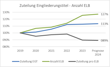 Betrachtet man die Entwicklung seit 2019, ist zu erkennen, dass die Anzahl der ELBs im Verlauf bis 2024 um über 27 % steigt. Im gleichen Zeitraum erhöhte sich die Mittelzuteilung für Eingliederung lediglich um 13,48 %. Dies bedeutet eine immer weiter sinkende Zuteilung pro ELB, sodass in 2024 nur noch weniger als 90 % der Mittel im Vergleich zu 2019 zur Verfügung stehen.