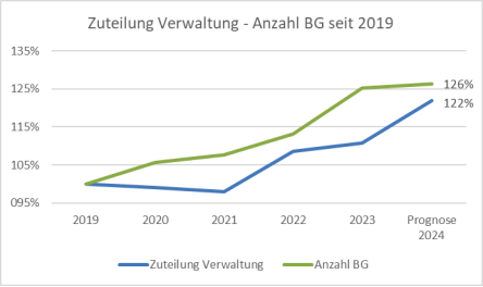 Auch im Verwaltungsbudget zeigt sich, dass die Zuteilung seit 2019 mit einer Steigerung von rund 22 % der Steigerung der Anzahl der Bedarfsgemeinschaften (+26 %) hinterherhinkt, während die Personalkosten aufgrund von Tarifsteigerungen deutlich steigen.