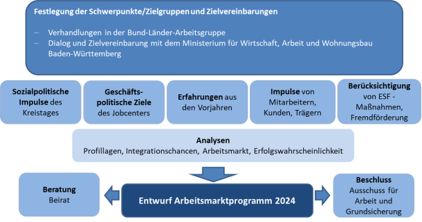 Anhand der Profillagen der Kunden, der Entwicklungen des Arbeitsmarkts, der Integrationen im vergangenen Jahr sowie der Dauer im Leistungsbezug wurden folgende Zielgruppen im Entwurf des Arbeitsmarktprogramms besonders berücksichtigt: