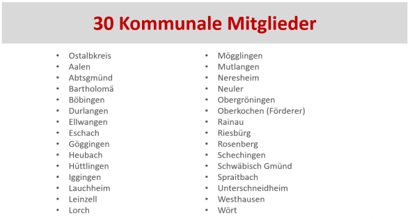 Aktuell sind neben dem Ostalbkreis weitere 29 Städte und Gemeinden des Ostalbkreises Mitglied im EKO. Die Stadt Oberkochen wird dabei gemäß ihrem Gemeinderatsbeschluss nicht als ordentliches Mitglied betrachtet, sondern als Förderer eingestuft.
