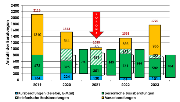 Im Jahr 2023 wurden durch das EKO insgesamt 1.770 Energieberatungen durchgeführt. Diese Summe setzt sich aus den gezählten Messeberatungen, den Kurzberatungen per Telefon (< 15 Minuten) und E-Mail sowie den detaillierteren Basisberatungen (persönlich, telefonisch, Dauer ca. 1 Stunde), wie folgt, zusammen: