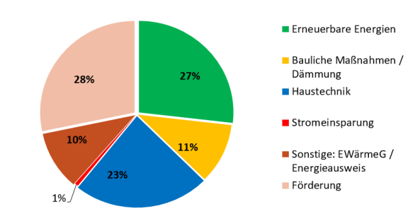 Aus der nachfolgenden Grafik ist ersichtlich, dass auch in 2023 der Schwerpunkt der Beratungstätigkeit weiterhin im Bereich von Altbausanierungen und Heizungsmodernisierungen inklusive der Integration von Erneuerbaren Energien, verbunden mit den jeweiligen Förderprogrammen, lag. Dabei wurden vermehrt Beratungen zu Photovoltaik und Wärmepumpen nachgefragt.