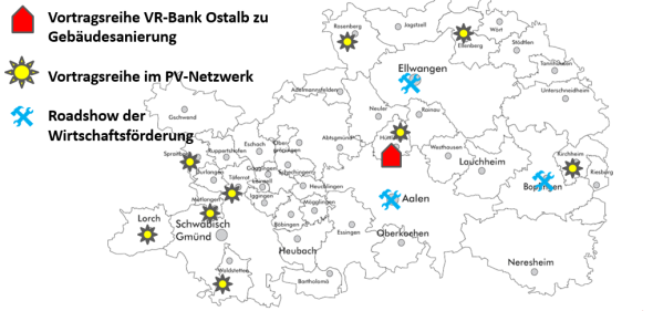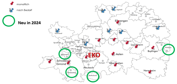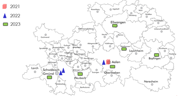 Ergänzend zu den Beratungen im Energieberatungszentrum in Böbingen fanden 2023 in folgenden Städten und Gemeinden regelmäßig monatliche Beratungstermine statt: