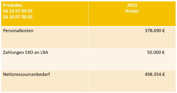Wie schon in den Vorjahren war das EKO auch in 2023 zusammen mit dem Referat Klimaschutz und Nachhaltigkeit unter den Produktnummern 56100701 und 56100702 wieder im Haushalt des Ostalbkreises abgebildet. Der Haushaltsansatz (Nettoressourcenbedarf) für 2023 wurde mit 498.354 € beziffert. Hierin sind Personalkosten in Höhe von ca. 378.690 € enthalten.