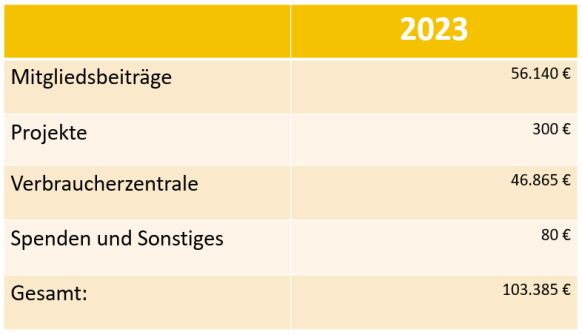 Als Einnahmen in 2023 konnte der Verein Energiekompetenz Ostalb e.V. neben den Mitgliedsbeiträgen in Höhe von 56.140 € auch durch das EKO-Team generierte Einnahmen aus Projekten und Beratungsleistungen für die Verbraucherzentrale sowie Spenden und Sonstiges in Höhe von 47.245 € verbuchen. Dies ergibt einen Gesamteinnahmenbetrag von 103.385 €, wie die nachfolgende Grafik zeigt: