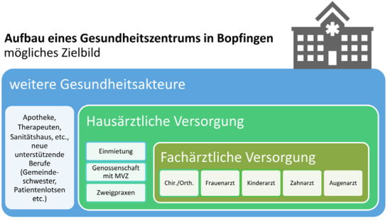 Mögliches Zielbild Gesundheitszentrum Bopfingen In den Planungen zum Gesundheitszentrum Bopfingen spielt deshalb nicht nur die hausärztliche Versorgung eine Rolle, sondern auch die Sicherstellung der ambulanten fachärztlichen Versorgung im östlichen Kreisgebiet sowie das Einbeziehen und die Zusammenarbeit mit weiteren Gesundheitsakteuren. Im bisherigen Planungsprozess wurde bereits ein mögliches Zielbild eines ambulanten Gesundheitszentrums entwickelt, siehe Abbildung 1.