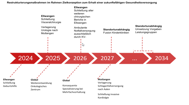 Der bisherige und aktuell noch amtierende Kreistag des Ostalbkreis hat am 25.07.2023 das Zukunftskonzept grundsätzlich bis im Grundsatz beschlossen. Mit dem Beschluss zum Standort des Regionalversorger in Essingen am 05.03.2024 wurde ferner bereits ein Umsetzungsbeschluss auf der Basis des Zukunftskonzeptes getroffen. Der nächste Umsetzungsbeschluss der nun ansteht, ist die Festlegung bzw. Konkretisierung des Medizinkonzeptes für das entwickelte Zielbild mit Regionalversorger und dezentraler Versorgung in Mutlangen und in Ellwangen. Dieses ist nun weiterentwickelt und beschlussfähig. Der neue Vorstand und insbesondere der Vorstandsvorsitzende hat nach dem Beschluss zum Standort unverzüglich mit der Konkretisierung des Medizinkonzeptes (Medizinkonzept 2035) begonnen. In der letzten Woche und Ende Mai trafen notwendige Berechnungen ein, mit dem Sozialministerium konnten diese am 10.06.2024 besprochen werden.