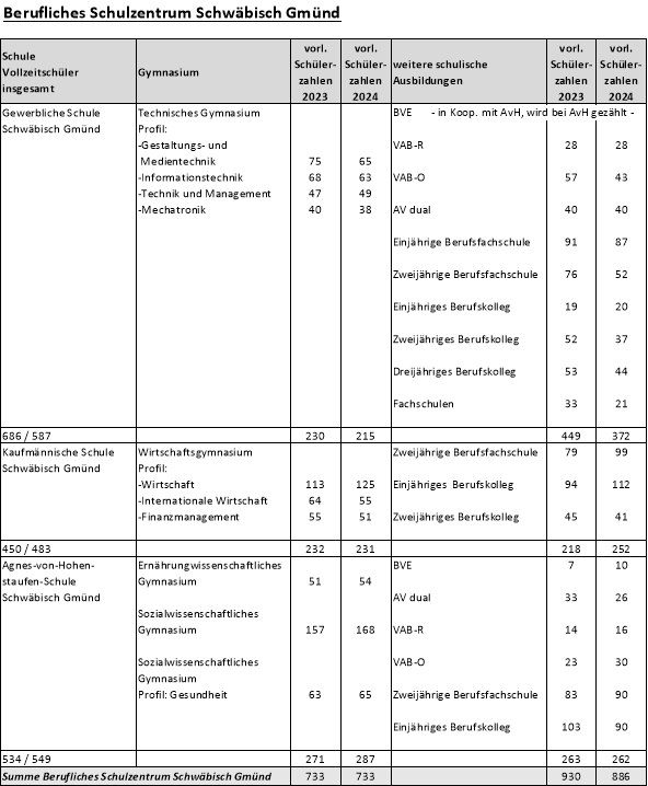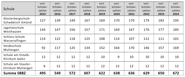 Als Fortführung der 2006 begonnenen Information über die Entwicklung der Schülerzahlen im Vollzeit- und Teilzeitbereich an den Beruflichen Schulen des Ostalbkreises wird auch 2024 diese Sitzungsvorlage dem Ausschuss für Finanzen, Bildung und Digitalisierung zur Kenntnis gegeben. Zum zehnten Mal werden auch die Schülerzahlen der vier Sonderpädagogischen Bildungs- und Beratungszentren (SBBZ) dargestellt.