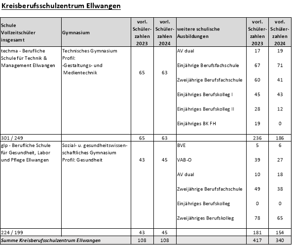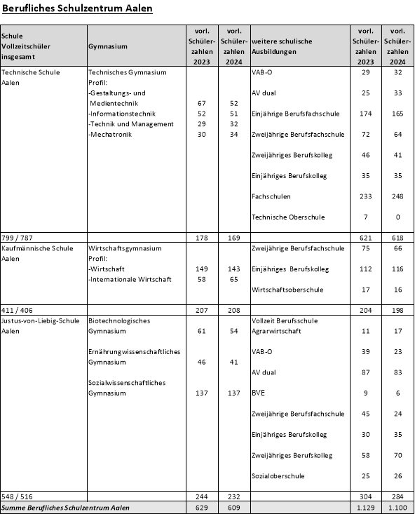 Der Ausschuss für Finanzen, Bildung und Digitalisierung nimmt den Bericht über die Schüleranmeldezahlen für das Schuljahr 2024/2025 im Vollzeit- und Teilzeitbereich und über die Lehrkräfteversorgung an den Beruflichen Schulen des Ostalbkreises zur Kenntnis.