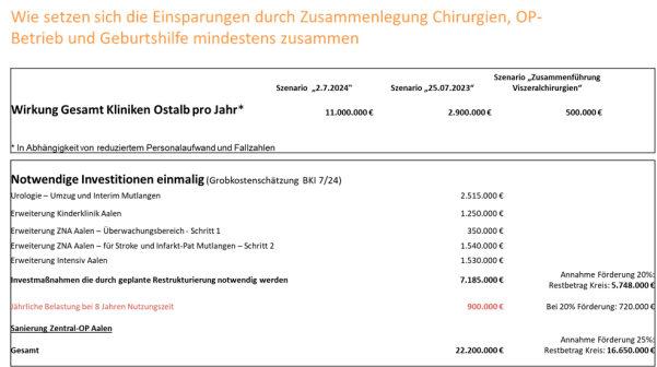 *Nach kompletter Stilllegung OP und Intensiv und sämtlicher dafür notwendigen personeller und strukturellen Optimierungsmaßnahmen, inkl. teilweise Leistungsverlagerung nach Aalen und Mutlangen. Versorgungsstrukturen werden über Aalen (Labor, Radiologie, Küche, Lager) abgebildet.