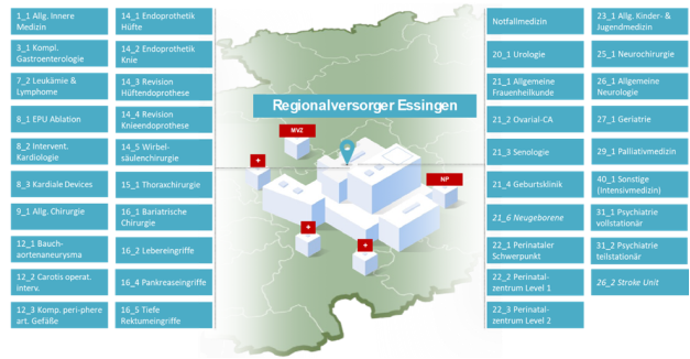 Alle anderen Leistungen (Kinderklinik Level 1-3, lokale Strokeunit, Herzkatheter 24/7, Gefäßchirurgie, Viszeralchirurgie, Innere Medizin mit Kardiologie, Onkologie, Pneumologie, Gastroenterologie und Komplexe Intensivmedizin) werden in Essingen zentralisiert.